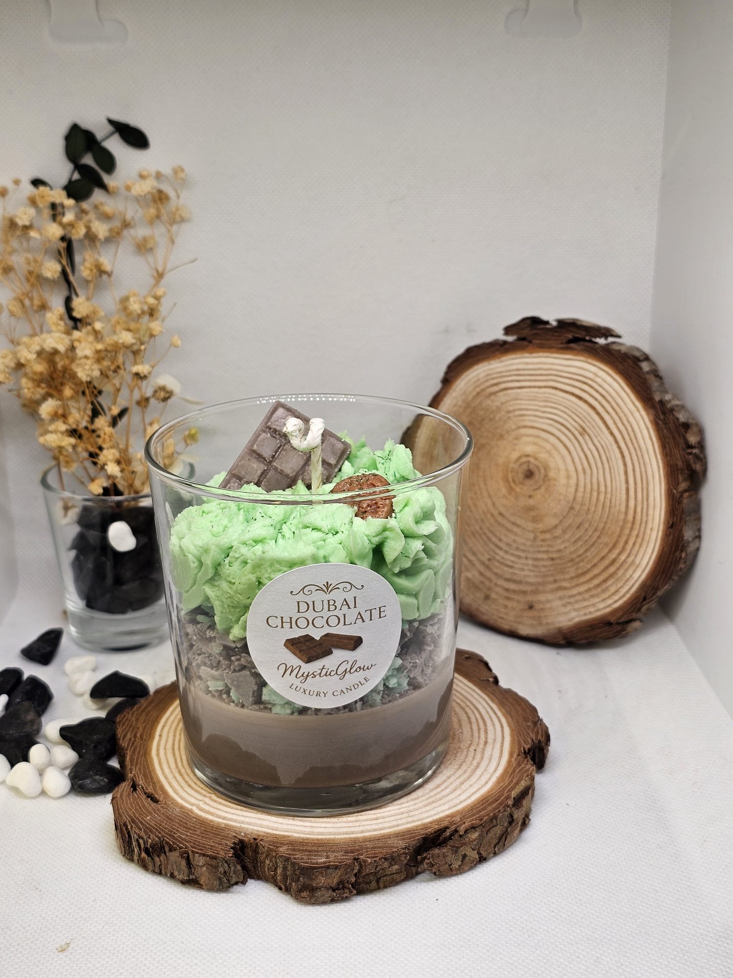 With its refined scent, handcrafted details, and premium-quality ingredients, the MysticGlow Dubai Chocolate Scented Candle offers a truly luxurious experience inspired by Dubai’s iconic charm.