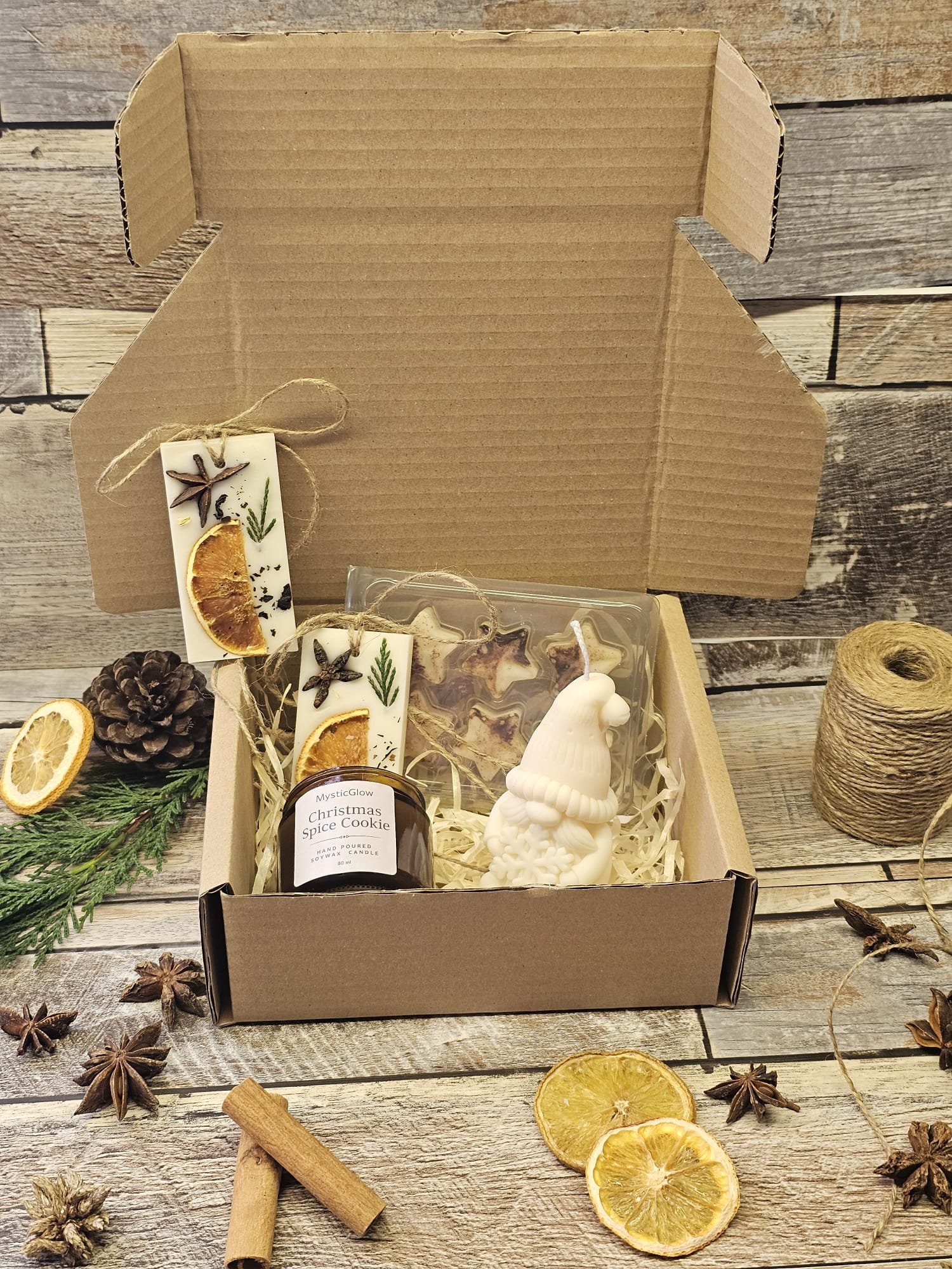 The MysticGlow Christmas Cosy Gnome Gift Set is a festive and beautifully presented holiday gift box designed for lovers of handmade winter décor. Inside the box, you will find a Christmas Spice Cookie soy candle, two botanical wax tablets with dried orange and spices, a pack of star-shaped wax melts and a handmade Christmas gnome candle. These items together create a warm, cosy winter atmosphere perfect for gift-giving and seasonal decoration.