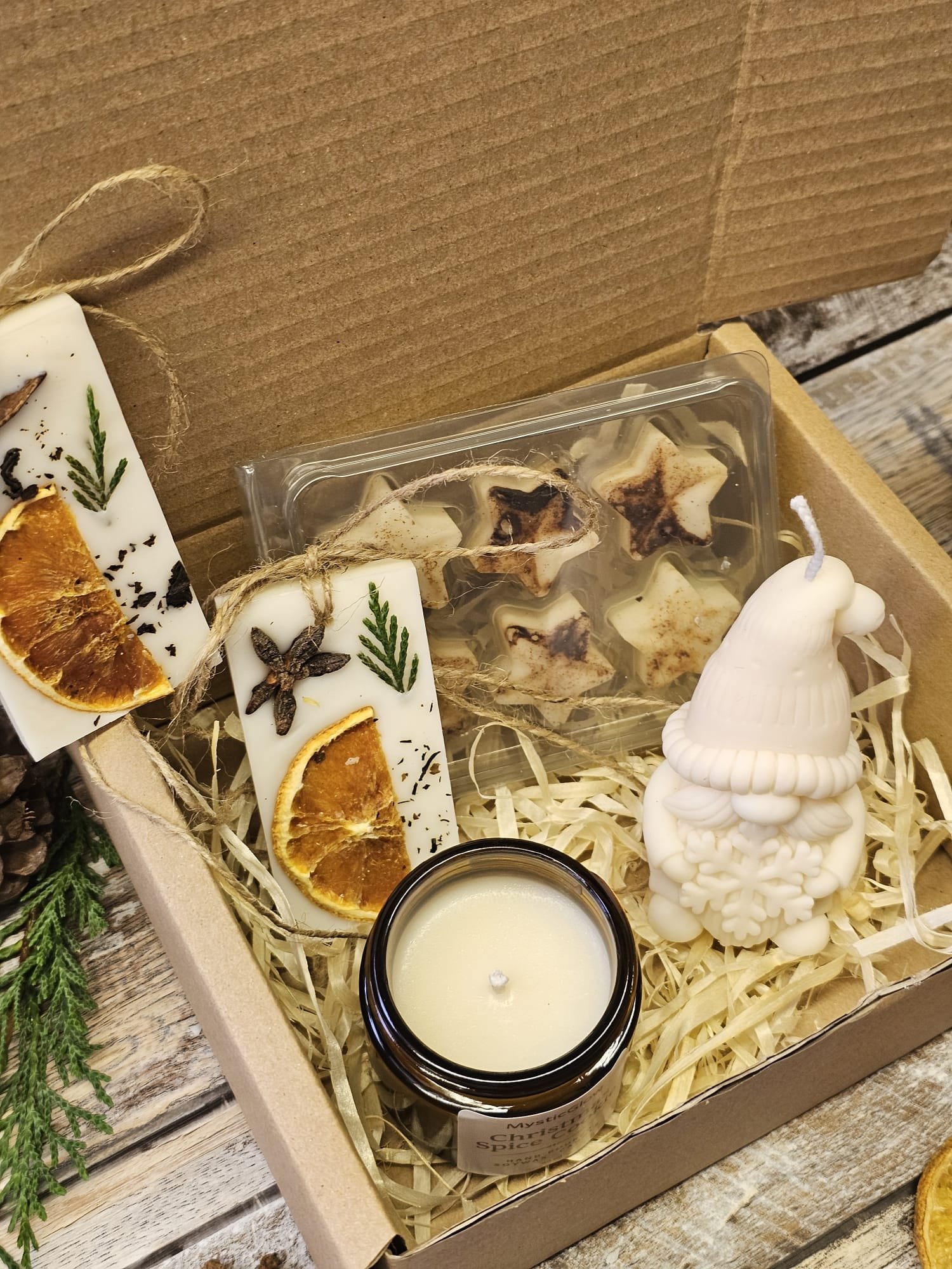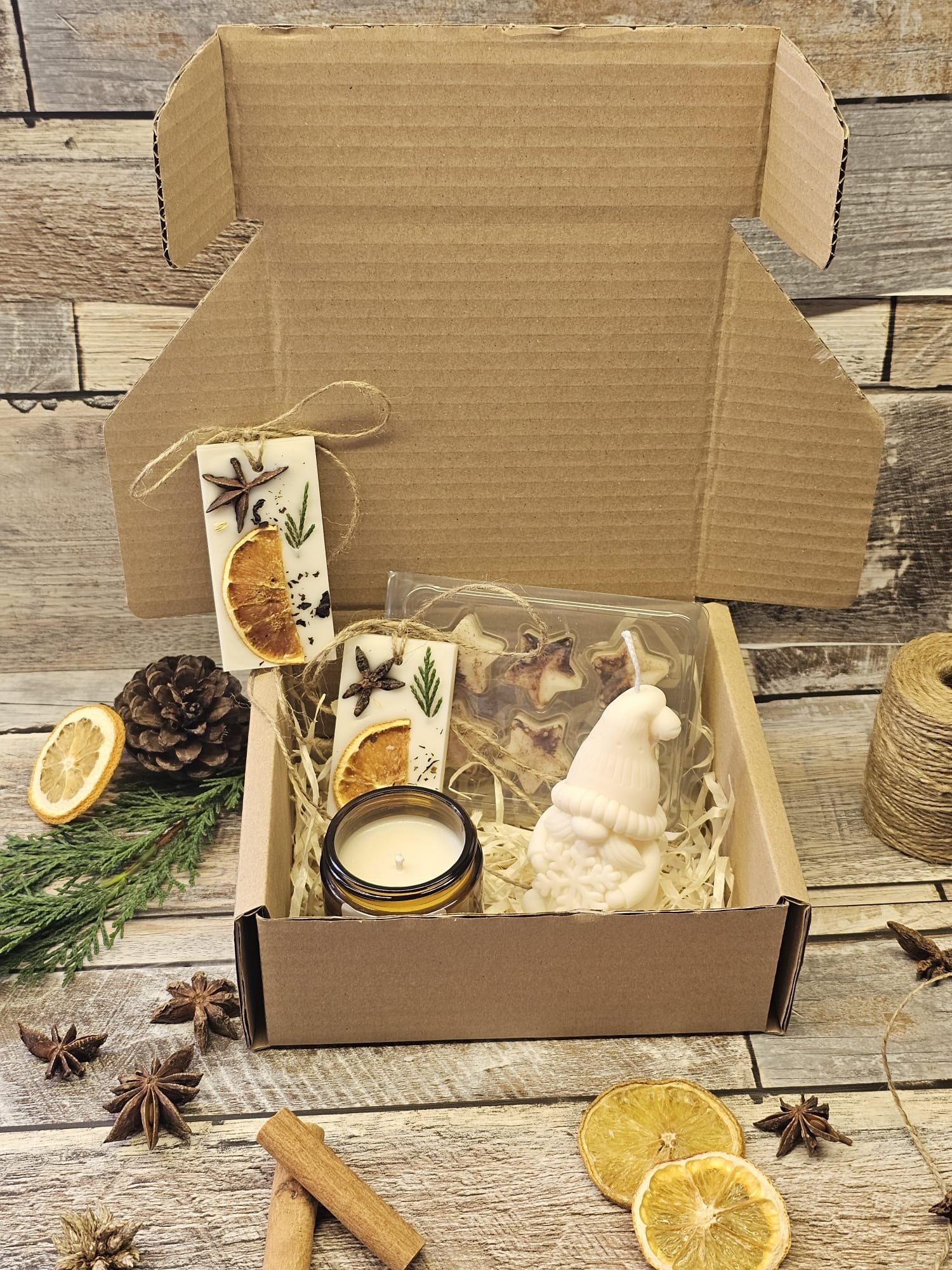 The box is filled with natural shredded filler and decorated with rustic Christmas elements such as dried citrus, cinnamon sticks, pinecones and winter greenery. Because of this, it is suitable as a thoughtful gift for friends, neighbours, family members, colleagues and teachers. Anyone who enjoys cosy Christmas scents and handmade gifts will appreciate this set.